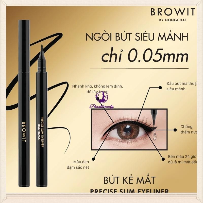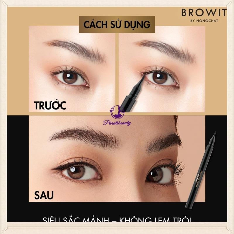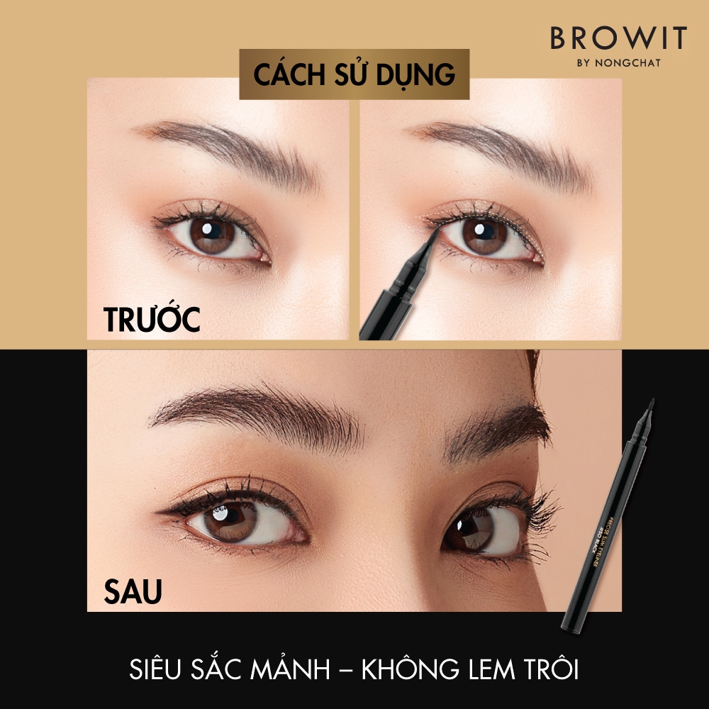 1/ Bút Kẻ Mắt Browit Siêu Mảnh 0.6ml là sản phẩm kẻ mắt đến từ thương hiệu mỹ phẩm Browit của Thái Lan, thiết kế ngòi bút siêu sắc mảnh chỉ 0.05mm vẽ đường kẻ sắc nét tạo điểm nhấn nổi bật và thần thái cùng độ chống thấm nước, không lem, giữ màu suốt 24 giờ. Sản phẩm đồng sáng tạo bởi NongChat – chuyên gia trang điểm hàng đầu tại Thái Lan. Đối tượng sử dụng: Muốn có đường kẻ eyeliner sắc sảo.