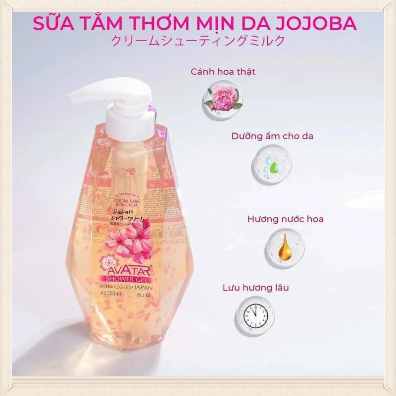 🌸Sữa Tắm Avatar Thơm Mịn Da Jojoba Bông Hoa Shower Gel là dòng sữa tắm đến từ thương hiệu chăm sóc da Avatar của Nhật Bản, được sản xuất trên công nghệ dây chuyền cải tiến đột phá của Nhật Bản với các hạt Jojoba siêu dưỡng và ngăn ngừa lão hóa da, các vitamin, protein collagen và siêu khoáng chất dưỡng da cùng một số chất dưỡng da khác giúp da sáng hơn. Đồng thời, mùi hương quyến rũ sẽ khiến bạn say đắm.