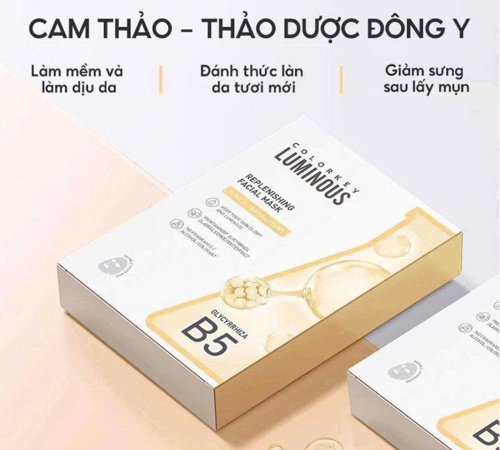 Mặt Nạ Colorkey Luminous B5 Facial Mask Replenishing Dưỡng Ẩm Dịu Da Thảo Dược Đông Y 25ml đến từ thương hiệu Colorkey với sự kết hợp giữa 2 thành phần là provitamin B5 và chiết xuất từ cây cam thảo mang đến tác dụng dưỡng ẩm và làm dịu da tức thì. Sản phẩm đặc biệt dành cho những làn da khô, giúp cân bằng độ ẩm và là liệu trình dưỡng ẩm chuyên sâu cho da, ổn định lớp nền.