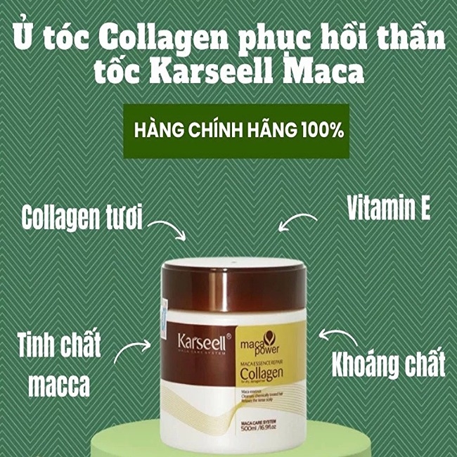 Kem Hấp Ủ Tóc Collagen Karseell Maca được chiết xuất từ các thành phần tự nhiên, trong đó gồm nhiều vitamin, protein và khoáng chất cùng với thành phần collagen giúp phục hồi độ ẩm, độ bóng mượt cho mái tóc và có tác dụng bảo vệ cho chân tóc; sửa chữa và khôi phục lại lớp biểu bì tóc bị hư hỏng; giúp tóc mềm mượt và chắc khỏe.