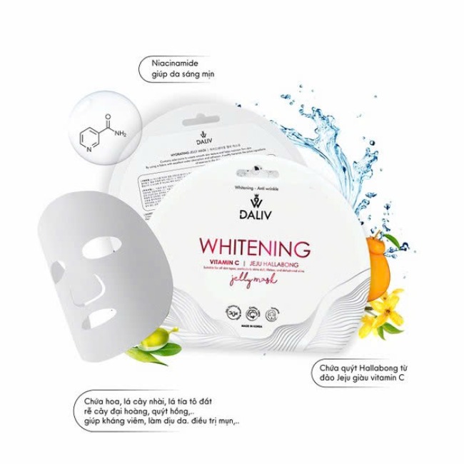 #Mặt nạ Daliv Vitamin C chứa Niacinamide và vitamin C tạo kết cấu da mịn màng và giúp sáng da, nâng cơ săn chắc. Bên cạnh đó hàng loạt những chiết xuất thiên nhiên được khái thác từ đảo ngọc Jeju như quýt Hallabong,… mang tới khả năng dưỡng ẩm, dưỡng mềm mịn, căng bóng hiệu quả. Bằng cách sử dụng chất liệu 100% cotton mỏng nhẹ nhưng có khả năng thấm hút và bám dính tuyệt vời, tấm sheet mask ôm khít gương mặt, nhanh chóng thẩm thấu các hoạt chất vào da.