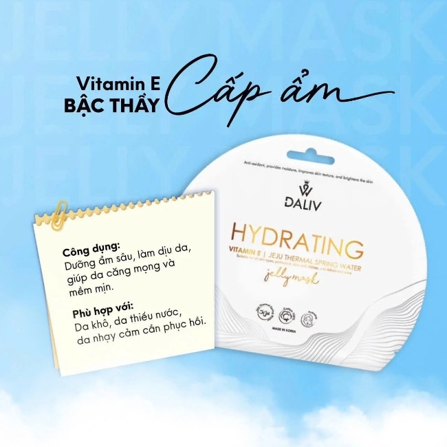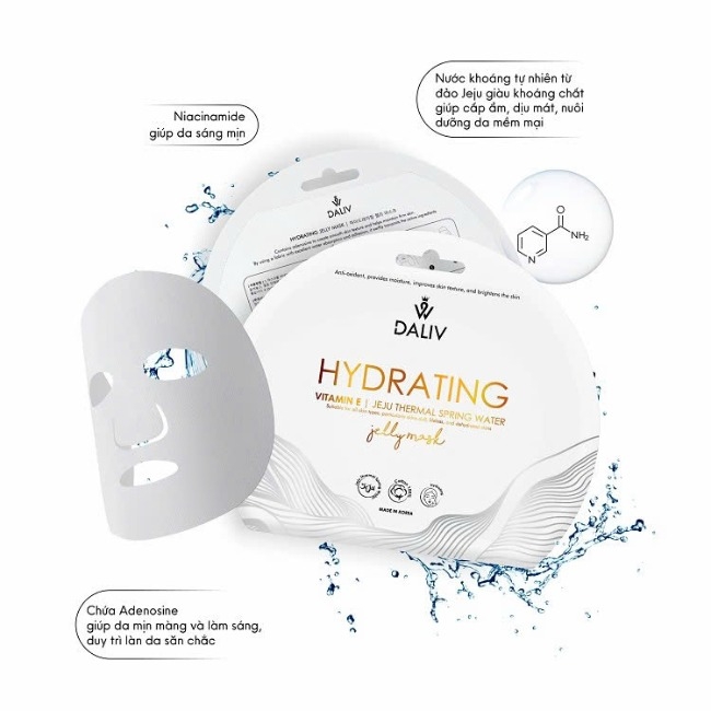#Mặt nạ Daliv Vitamin E chứa Adenosine – một chất tự nhiên có nguồn gốc từ tế bào sống giúp tạo kết cấu da mịn màng, làm sáng và duy trì độ săn chắc. Các dưỡng chất nổi tiếng như Vitamin E, Niacinamide kết hợp cùng nước suối khoáng nóng Jeju dưỡng ẩm, cấp nước cho da căng bóng, sáng mịn.