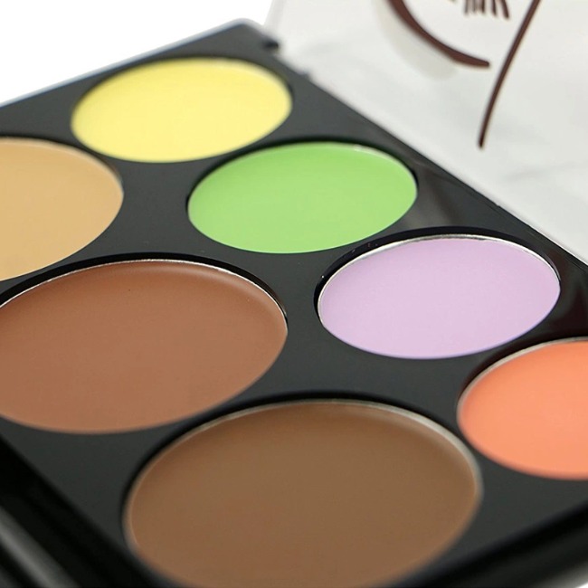 - Che khuyết điểm: Ô màu vàng và đỏ giúp che giấu các đốm nâu, tàn nhang và quầng thâm. Ô màu xanh lá che phủ các nốt mụn, vùng da ửng đỏ và ô màu tím giúp hiệu chỉnh các vùng da không đều màu.