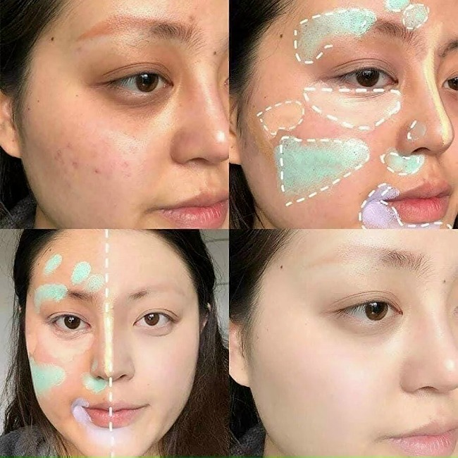 + Màu Xanh: che nốt mụn đỏ, các vết đỏ.