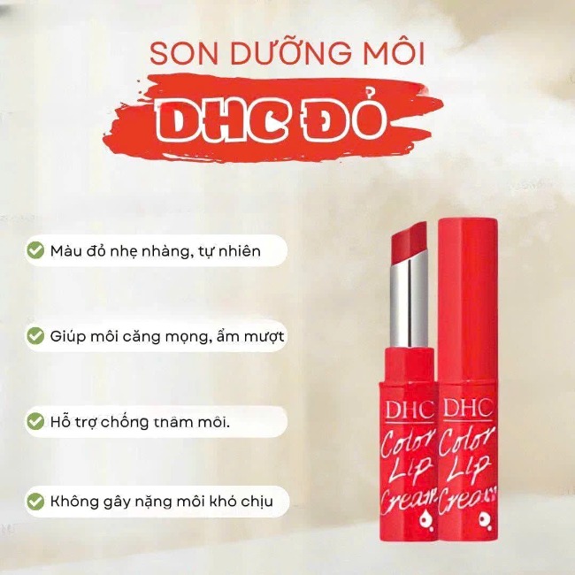 Son Dưỡng Môi DHC Pure Color Lip Cream Có Màu - thuộc thương hiệu DHC nổi tiếng Nhật Bản với thành phần dưỡng chất Vitamin E, chiết xuất nhau thai cừu, dầu olive và squalene, hỗ trợ bổ sung độ ẩm, cải thiện tình trạng khô môi do thời tiết, hỗ trợ làm dịu làn môi nứt nẻ một cách nhẹ nhàng mà hiệu quả giúp đôi môi của bạn trở nên căng mọng, hỗ trợ giảm nhanh tình trạng xỉn màu môi, thâm môi, lấy lại đôi môi quyến rũ. Bên cạnh đó, sản phẩm có kết cấu chất son nhẹ, thẩm thấu lên môi nhanh chóng, không gây bóng, dính hay khó chịu, không màu, không mùi nên vô cùng dễ sử dụng và lành tính cho người dùng.