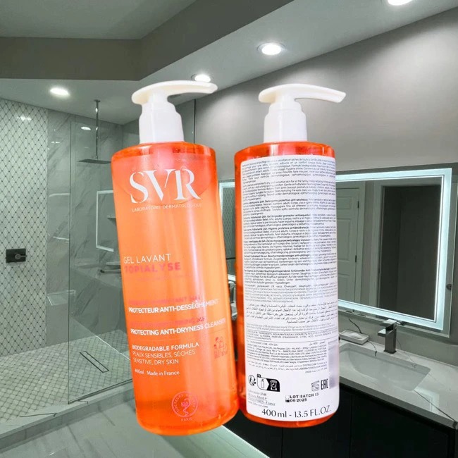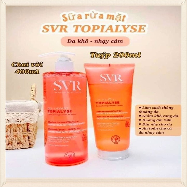- Sữa rửa mặt dành cho da khô và da nhạy cảm SVR là dòng sữa rửa mặt dược mỹ phẩm dịu nhẹ không xà phòng, giúp cân bằng môi trường vi sinh trên da, làm sạch mà không làm mất độ ẩm tự nhiên của bề mặt da. Gel còn tăng cường độ ẩm, nuôi dưỡng sâu bên trong tế bào da giúp da luôn ẩm mượt, làm dịu tức thì cảm giác ngứa rát, căng kéo do da bị khô, kích ứng, bảo vệ lớp màng hydrolipid của da mang lại cảm giác thoải mái và bảo vệ cho làn da khô và nhạy cảm, mang lại làn da mềm mại và thoải mái. SVR Topialyse Gel Lavant Cleansing đã được thử nghiệm trên da nhạy cảm dưới sự kiểm soát của các chuyên gia da liễu, nhi khoa, nhãn khoa và phụ khoa. Hiệu quả đã được chứng minh lâm sàng lên đến 169% da được dưỡng ẩm và 195% da thoải mái hơn. Ngoài ra, với độ an toàn cao nên SVR Topialyse Gel Lavant có thể sử dụng cho trẻ sơ sinh mới ra đời. Dùng để để rửa mặt, tắm gội và vệ sinh vùng kín.