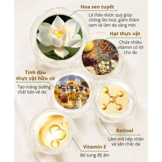 ** Thành phần: Hoa sen tuyết, hạt thực vật, tinh dầu thực vật hữu cơ, retinol, vitamin E.