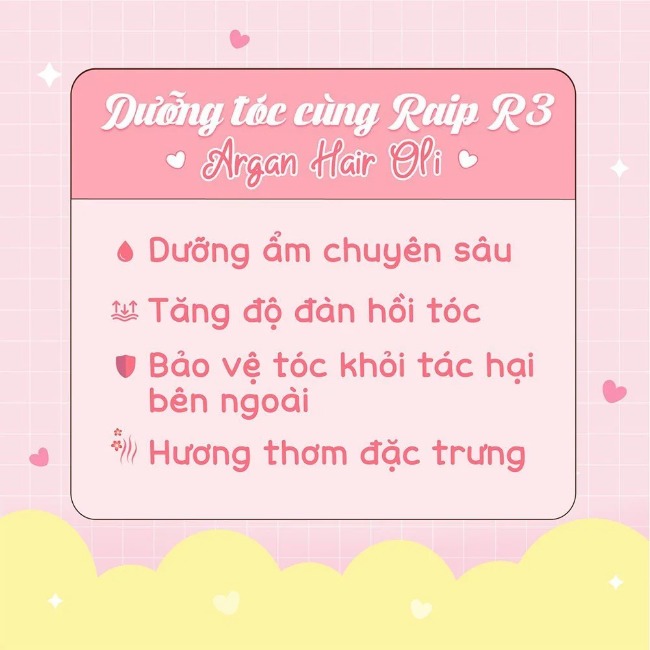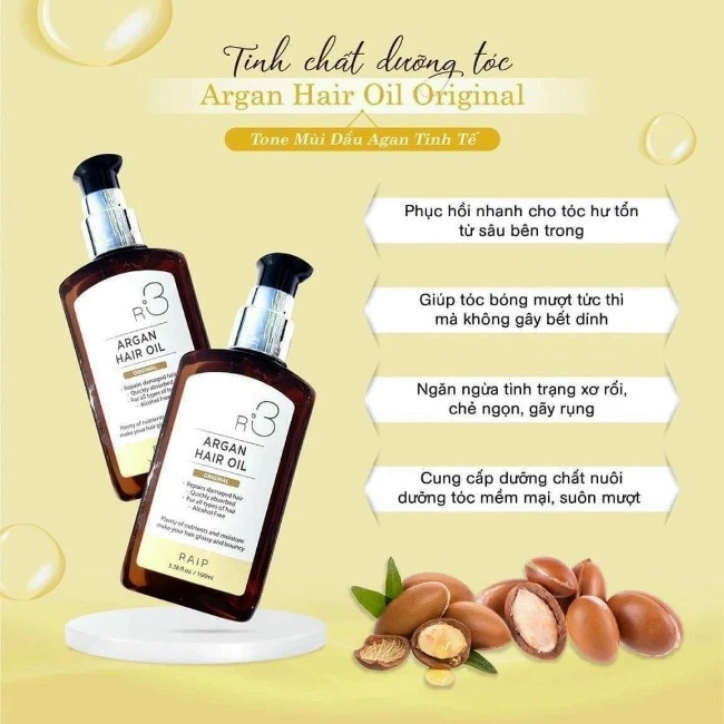 - Raip R3 Argan Hair Oil là dạng dầu dưỡng tóc có màu vàng nhạt, kết cấu vừa giống dầu lại vừa giống gel nhưng khá lỏng thấm nhanh không gây bết dính cho tóc. Khi dùng bạn chỉ cần lưu ý một chút là nên dùng cho phần đuôi tóc thôi không dùng cho phần chân tóc sát da đầu nhé.