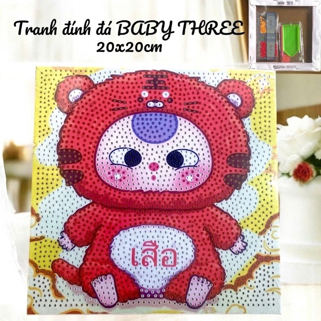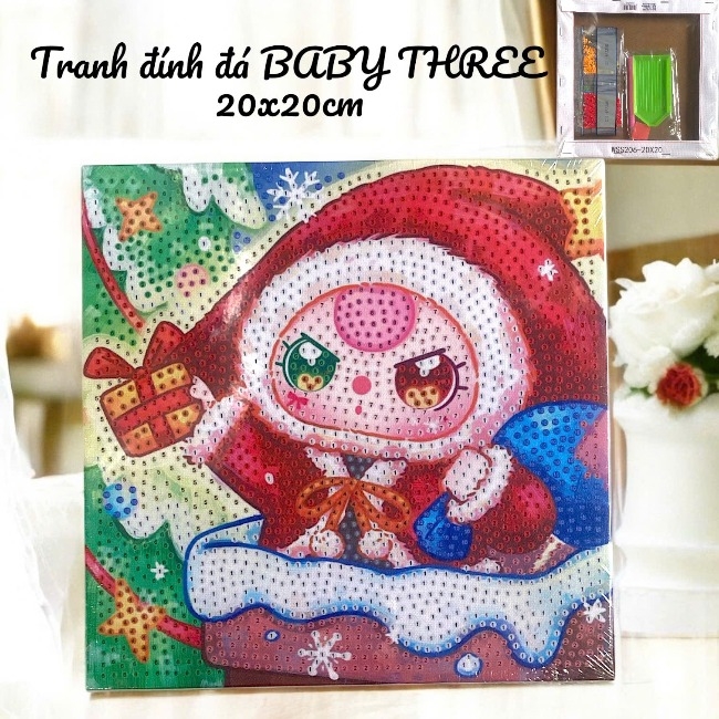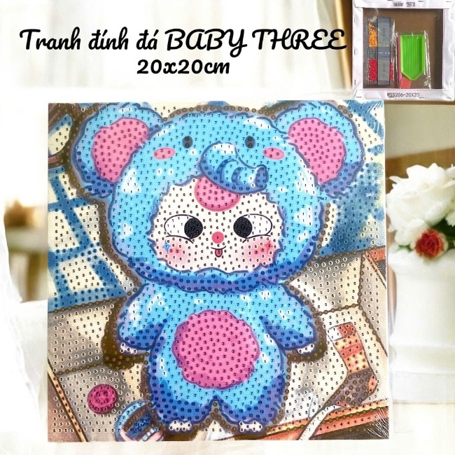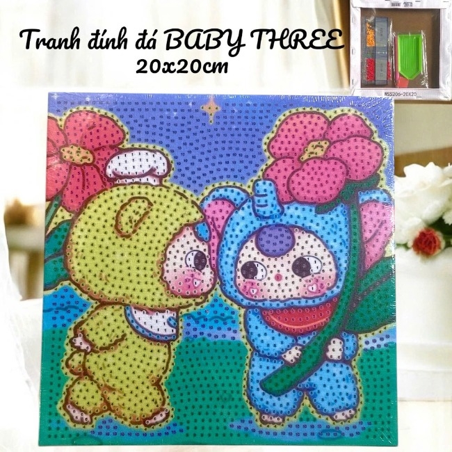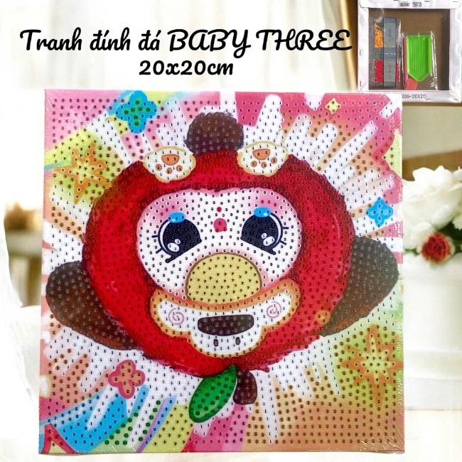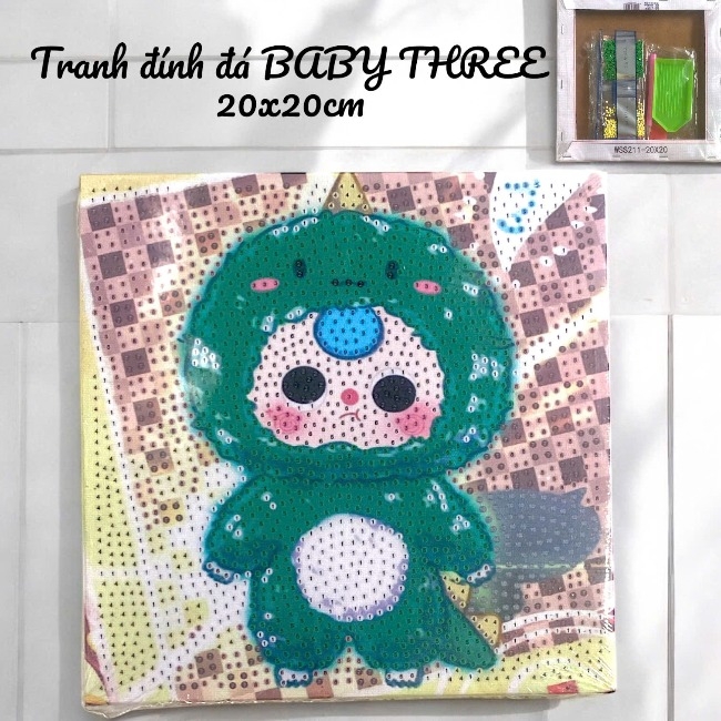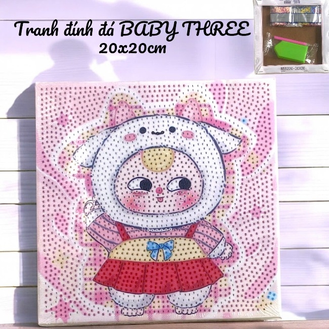 Tranh đính đ.á size 20x20cm khung gỗ, hình nhân vật dễ thương kèm màu