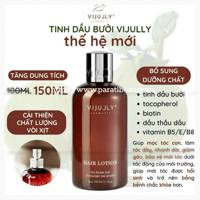 Xịt Tinh dầu bưởi Vijully được chiết xuất từ tinh dầu vỏ bưởi kết hợp với dầu thầu dầu, vitamin B5, vitamin E, vitamin B8,.. giúp kích thích mọc tóc con, làm dịu da đầu, hỗ trợ giảm viêm, giảm gàu. Đặc biệt, mái tóc được hồi sinh và trở nên bồng bềnh chắc khỏe hơn với hợp chất tocopherol và biotin, nuôi dưỡng và bảo vệ mái tóc khỏi tác hại của môi trường.