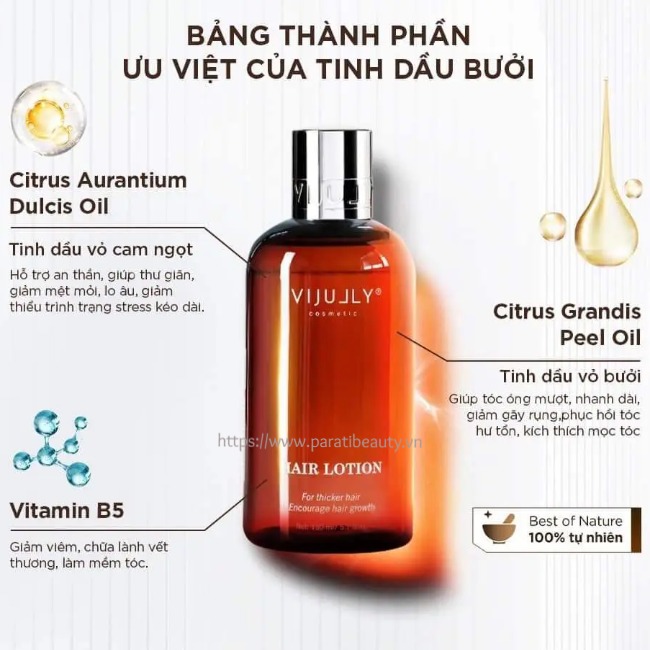 - Xịt tinh dầu bưởi Vijully được chiết xuất từ tinh dầu bưởi thiên nhiên nên cực an toàn da đầu và sức khỏe